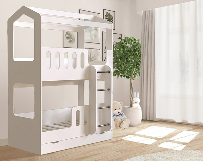 Конструкция сделана из экологически чистой ЛДСП толщиной 16 см, что делает ее прочной и устойчивой. В основаниях матраса на верхнем ярусе используется лист ЛДСП, на нижнем - реечное дно для придания