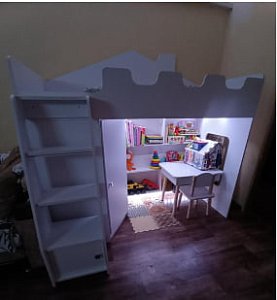Особенностью этой модели является наличие прямой лестницы с дверцей, которая не только придает кровати-домику особый шарм, но и обеспечивает легкий и безопасный доступ к спальному месту. Стеллаж, расположенный внизу спального места, предоставляет дополнительные возможности для хранения вещей и игрушек.