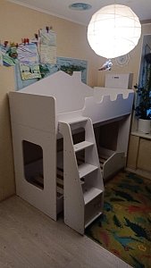 Лестница с дверью обеспечивает удобный и безопасный подъём на второй ярус. На нижнем ярусе установлен безопасный бортик, который защищает от падений во сне. Боковые стенки со световыми окнами создают уютную атмосферу и позволяют наблюдать за звёздным небом прямо с кровати.