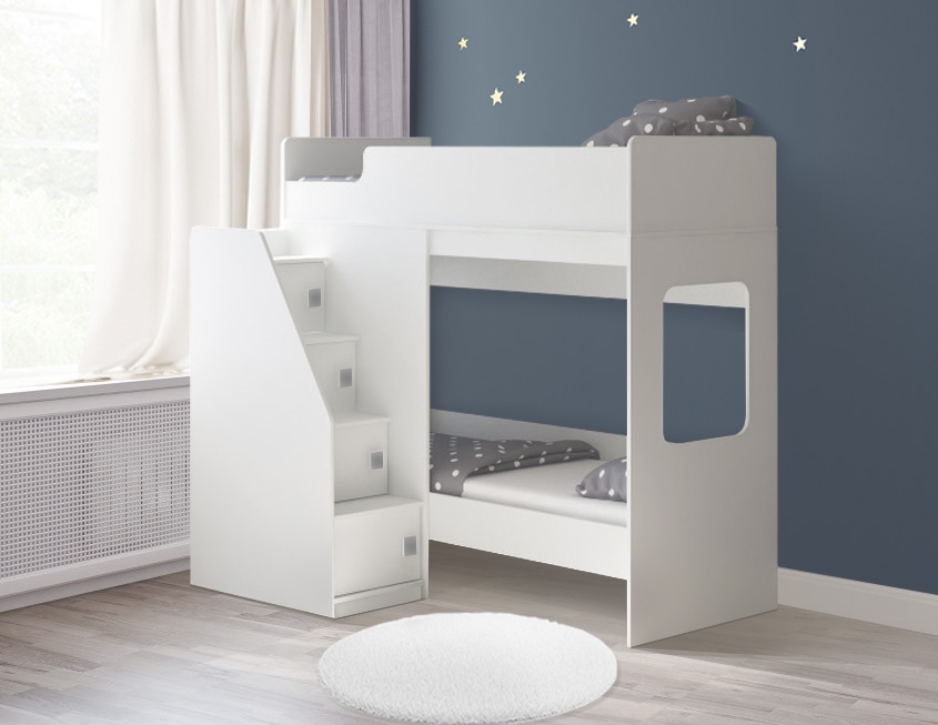 Классическая детская двухъярусная кровать с двумя параллельными спальными местами и угловой лестницей-стеллажом.