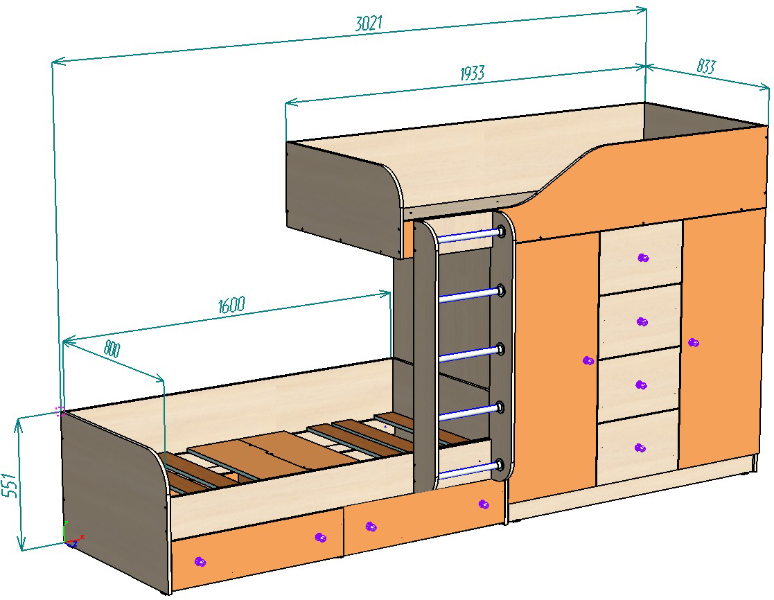 Особенности данной модели: нижнее спальное место: 160х80см. Общая длина модели составляет 302см