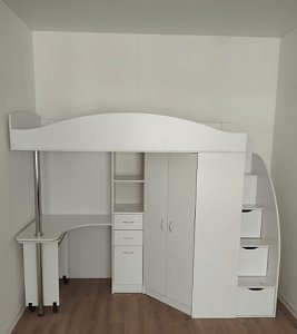 Сборка, руб. 3192 Доставка внутри МКАД, руб. 1100 Подъем, руб. 600 Длина, см 232 Высота, см 182 Ширина, см 85 Спальное место ШхД, см 80х190 Гарантия, год 2 Вес, кг 180 Объем, м3 0.3 Количество коробок 6 Размер коробок макс 80/190/45 Максимальная нагрузка на спальное место, кг 80 Материал ЛДСП Аксессуары Детский матрас Дрим Baby Dream TFK, Детский матрас Дрим Baby Sleep Dream TFK, Матрас Classic Roll Slim, Aquastop+ водонепроницаемый с боковинами, Кресло Юта У-16 ОтзывыЕкатеринаЕще фотоЕкатеринаФотоЕвгенияКровать заказывали для дочки. Она уже пошла в школу и нужно было объединить спальную и "рабочую" зону в небольшой комнате. Этот вариант нам понравился сразу. С оформлением заказа проблем не возникло. Менеджер перезвонил и вежливо уточнил модель, цвет и условия доставки. кровать привезли через день, в субботу, как мы и планировали. Собрали довольно быстро. Кровать качественная, думаю прослужит нам довольно долго. А главное - дочка довольна.ИринаКупили такую кровать для нашей дочери. Привезли достаточно быстро, на месте собрали, все аккуратно. Это даже не кровать, а целый комплекс. Очень удобно: есть и ящички, куда можно сложить вещи ребенка; и рабочая зона для учебы. За счет того, что кровать на втором ярусе, получилась хорошая экономия пространства - теперь больше места, где дочка может свободно играть.ИлонаКровать покупали для дочки, с доставкой и сборкой проблем не было. Мебель отличного качества, хорошая фурнитура, нет постороннего запаха клея. Я довольна покупкой, теперь у дочки в комнате стильная и современная мебель.МаринаЗаказывали 2 кровати для сына и дочери. Очень довольны покупкой. Дети в восторге. Спасибо большое!МаксимДочка счастлива, кровать и ящики уже завалены игрушками. Она довольна, мы довольны. Собрали быстро, аккуратно.ГостьДоставка быстрая, Цена соответствует качествуТанюша БодинаВсё очень понравилось, доставили быстро, сборка очень простая, все детали подписаны. А ещё понравилось, то что сразу можно подобрать матрасы)ГостьЗаказали для своего сына и очень довольны. В наборе есть шкафы для игрушек, книжек, одежды. Мебель очень прочная и компактная, а все ручки у шкафов безопасны и удобныОльгаОтлична кровать,удобная,качественно сделана. Собрал муж самостоятельно(сборка простая,инструкция предельно понятная) Еще раз огромное Вам спасибо за такое качество и низкие цены! Недостатков не нашлаЖаннаДоставляли в Питер через транспортную компанию. Немного волновались что предоплата была, но не обманули! Качество ОК!ГостьБрали у вас эту кровать. С доставкой проблем не возникло, брака нету. Собрали оперативно и по цене у вас приемлемо. В общем, не зря к вам обратился буду рекомендовать друзьям и родным.ВикторЗаказывали кровать, очень подробно нам за нее объяснили, посоветовали, заказ оформили быстро, так же быстро отправили и доставили. Кровать в очень хорошем качестве из прочного не вредного для здоровья материала. Вышла нам по очень хорошей цене, плюс очень ответственные работники нам ее еще и помогли собрать, как оказалось это очень легко.ОксанаЗаказала для сына кровать чердак Юниор 4 и шкаф Мартин. Остались очень довольны!!! К кровати предложили сразу матрас и детское кресло. Заказали все в одном месте. Привезли в течение 3 дней и сразу собрали. Кровать очень удобная, занимает мало места, вместительный шкаф и самое главное без острых углов, закругленные края-это очень вашно 