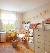 Если площадь комнаты всего 8 м2 или около того, а детей в семье двое, задача родителей многократно усложняется. Разделить комнату пополам не выйдет. Лучший вариант – это двухъярусные кровати, а если детям уже более 6 лет, то оба спальных места можно расположить на втором ярусе, оставив пространство под кроватью для шкафов и столов. Остальное место можно использовать для игр и спорта.