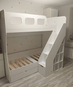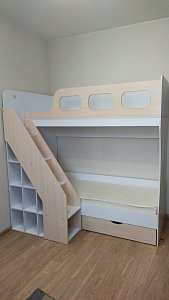 Удобная, безопасная лестница со встроенными полочками для книг и игрушек и комфортная высота кровати. В нижнюю кровать встроен выдвижной ящик для белья и игрушек.