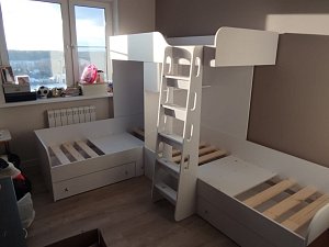 Добрый день! Хотим и мы своей семьей оставить отзыв о кровате чердаке Трио. Первые эмоции детей: восторг, визг)))! Места без споров распределили мгновенно! Очень удобная, компактная кровать. Кровать купили в цвете Винтерберг, очень гармонично влилась в комнату к существующей мебели.отдельная благодарность сборщику, очень быстро и аккуратно все собрал. с 26.06.2022 тет драйв пройден на 10++++