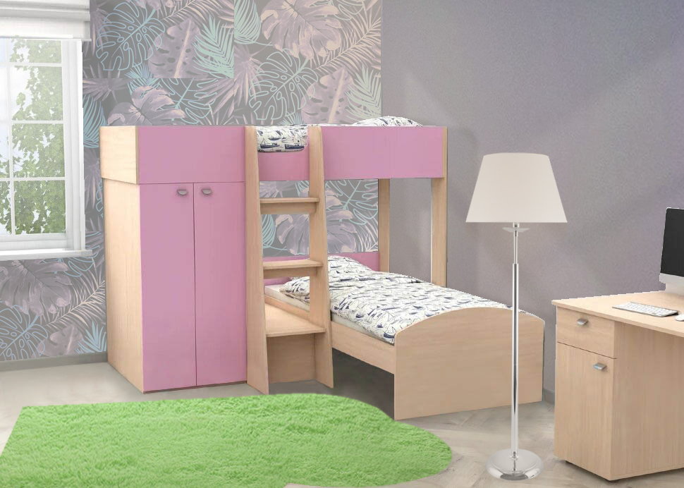 В базовую комплектацию входят: двухъярусная кровать, лестница, шкаф для одежды (3 полки + штанга) и прикроватная полочка - столик возле нижнего яруса под лестницей.