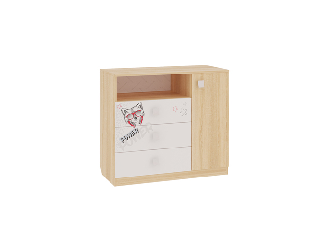 3 выкатных ящика, ниша и закрытые полки, все что нужно что бы разместить вещи вашего ребенка. Эффектный принтерный рисунок на фасадах выдержан в общем стилистическом решении. Рисунок устойчив к истиранию и ультрафиолету. Открытая ниша для гаджетов, столешница толщиной 25мм, на которой с легкостью поместиться большой телевизор. -