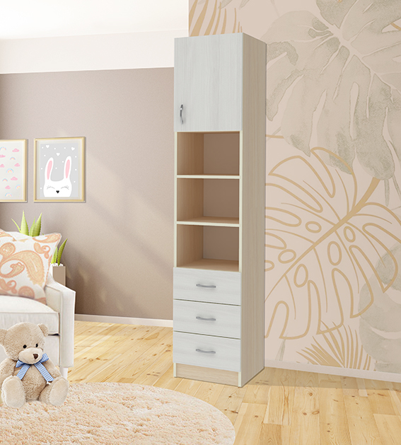 Сложно представить комнату, в которой живет ребенок, без шкафов, ведь детская – это место, которое выполняет множество функций: здесь ребенок отдыхает, спи, учится, играет, хранит свои вещи, делает уроки, проводит досуг. А значит, пространство детской комнаты должно быть организовано максимально эффективно, а каждый ее квадратный метр использован рационально. И для этих целей идеально подходит модульная детская мебель, составной частью комплектов которой является шкаф-пенал с открытой средней частью, верхним вместительным ящиком с распашной дверцей сверху и тремя выдвижным ящичками в нижней части.