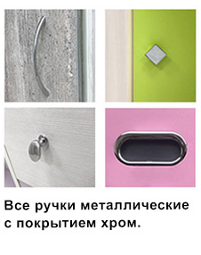 Мебель изготовлена из ламинированного ДСП, с использованием кромки АБС, что позволяет продлить срок службы изделию и сохранить внешний вид. Отсутствие острых углов является самым главным критерием травмобезопастности детей.