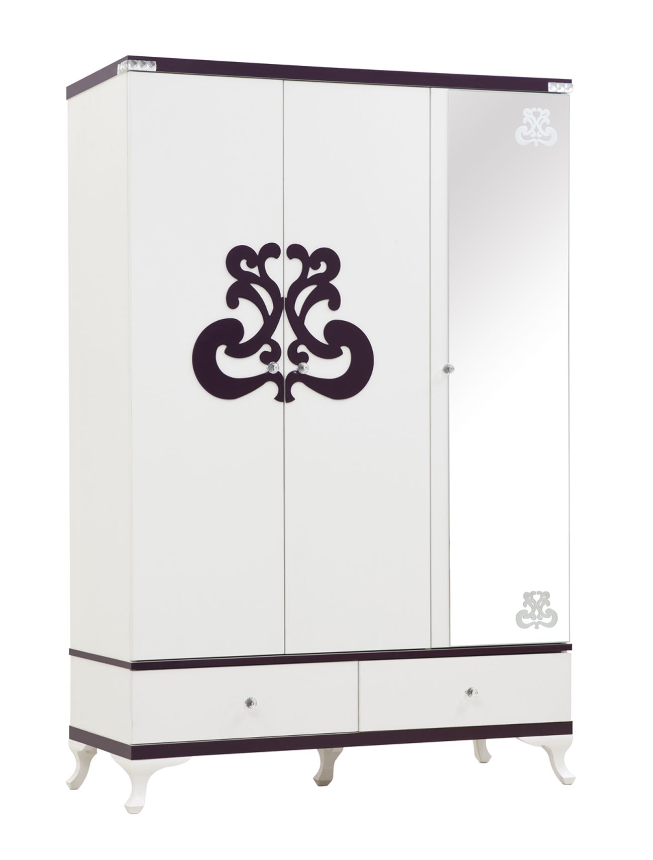 Шкаф с зеркалом,на устойчивых, изогнутых ножках, створки которого украшены оригинальной аппликацией приглушенного, фиолетового оттенка.
