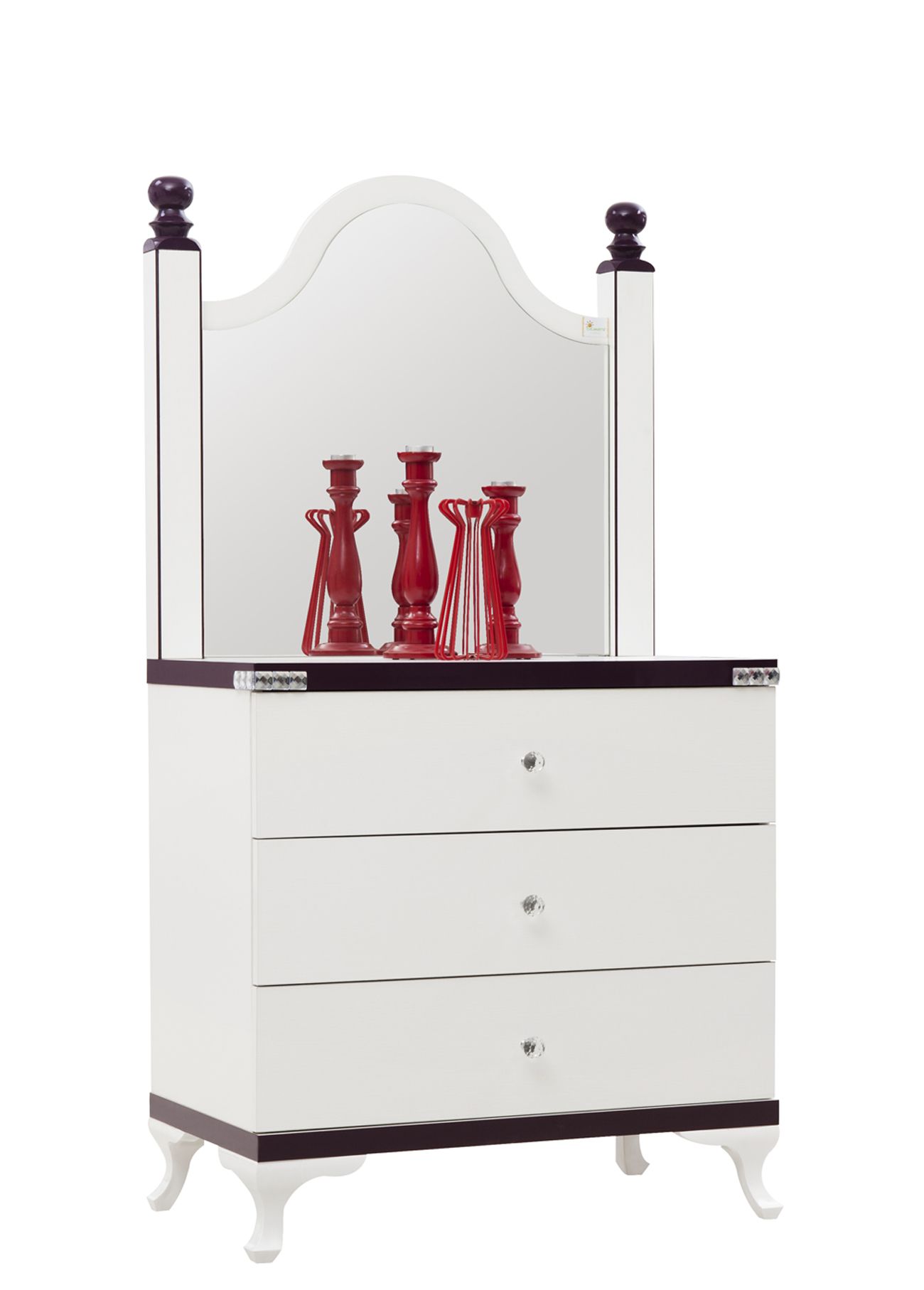 Изогнутые ножки и скромный, цветной кант добавляют общему облику комода ещё больше утонченности и изящества.