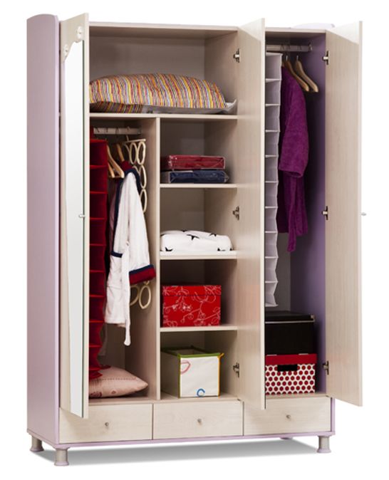 Два отделения для хранения вещей на вешалках - одно для блузок и кофточек, другое для пальто и курток, полки для белья и головных уборов.