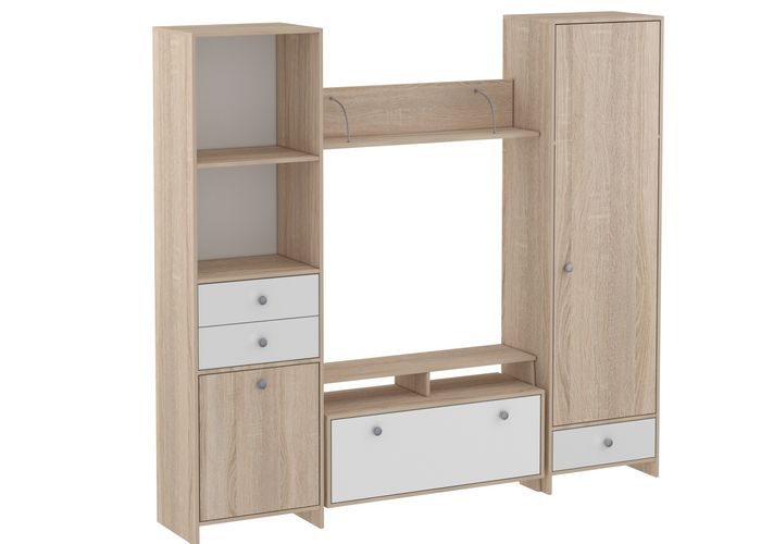Композиция «Ультра» выполнена из ЛДСП текстура Дуб Сонома,что позволяет ей отлично компановаться со всей мебелью серии «Ультра».