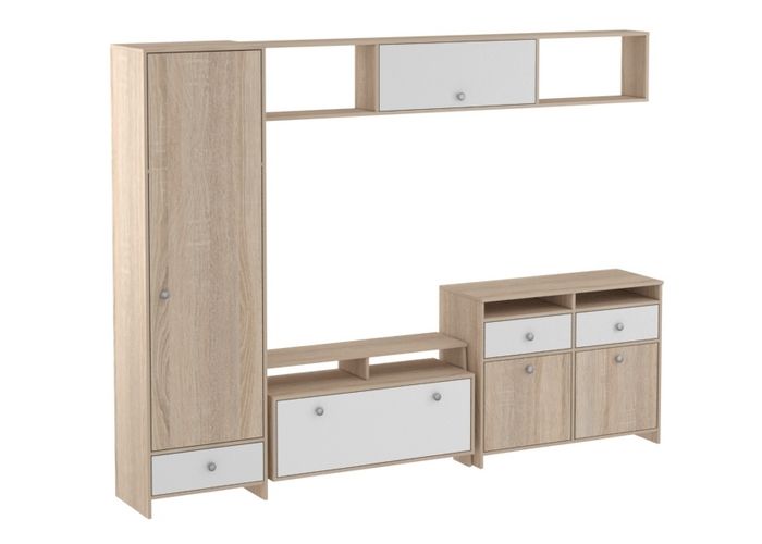 Композиция «Ультра»состоит из следующих модулей (слева направо): шкаф для одежды ШК-6,полка интерьерная П-8, тумба ТВ-11, комод К-7
