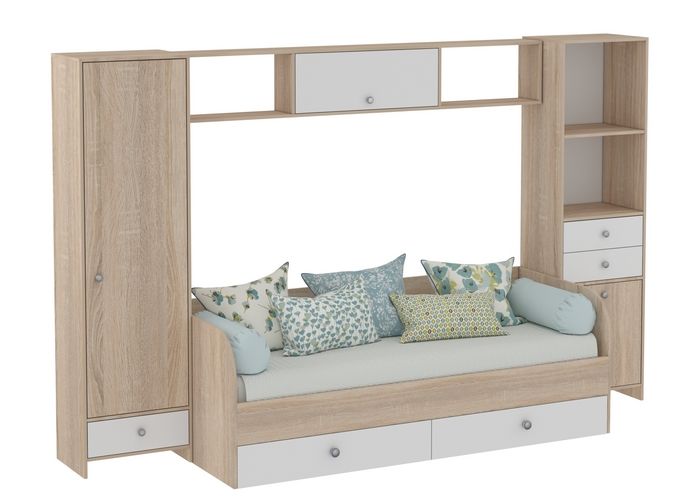 Композиция «Ультра»состоит из следующих модулей (слева направо): шкаф ШК-6 «Ультра»,кровать КР-4 «Ультра», полка П-8 «Ультра», шкаф ШК-5 «Ультра»