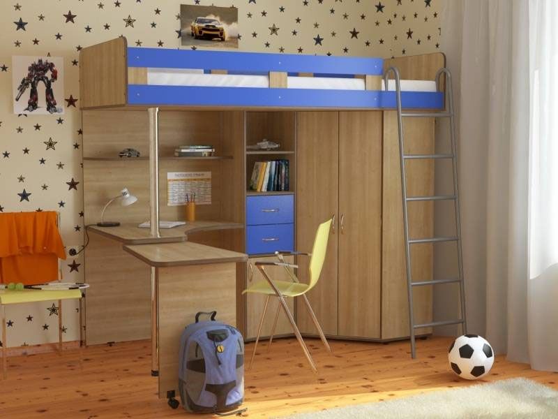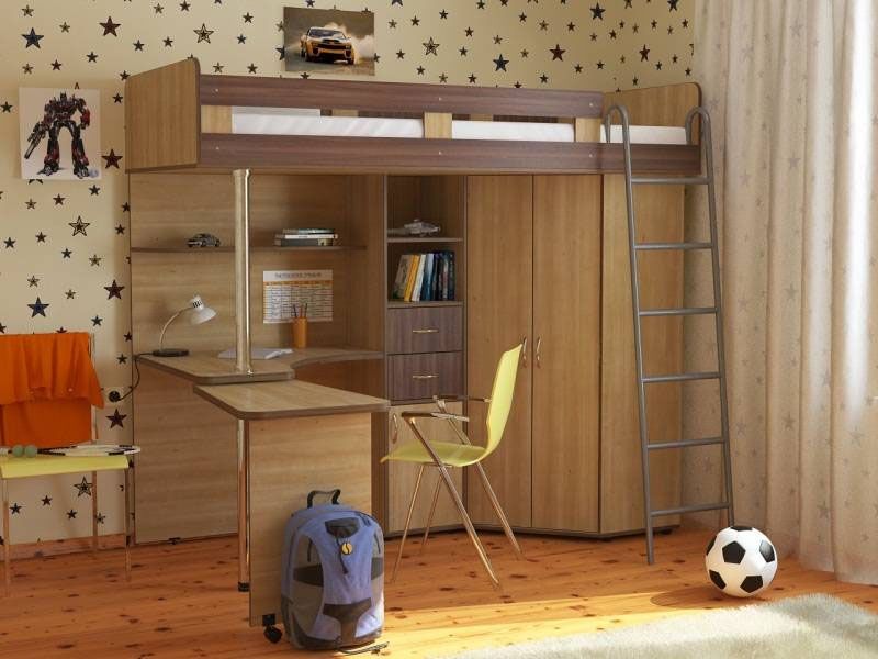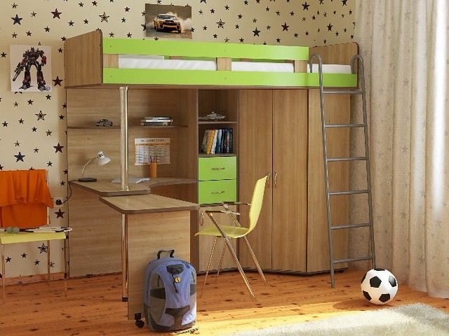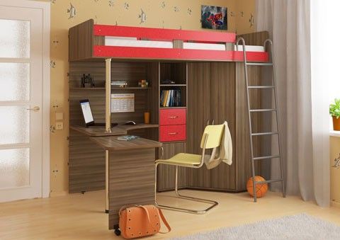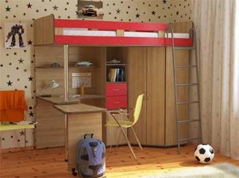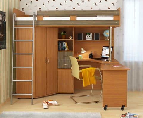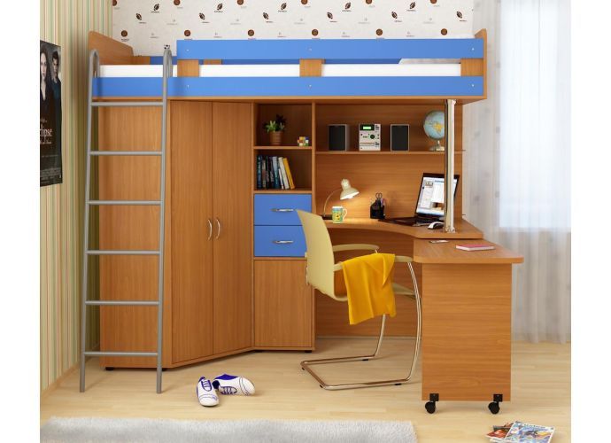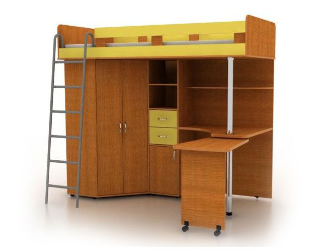 Кровать-чердак с металлической лестницей состоит из изящного углового столика,который в целях экономии драгоценных квадратных метров можно закатывать под основную часть столешницы, углового шкафа с двумя дверцами и небольшой приставной тумбочкой, а также различных открытых полок и полочек для книг, игрушек и других личных вещей.