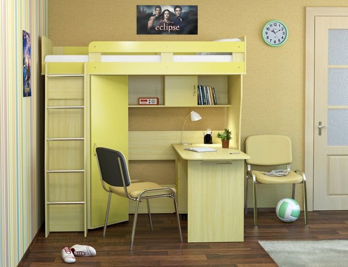 Напольной кроватью, отд. столом, тумбой, встроенной столешницей.