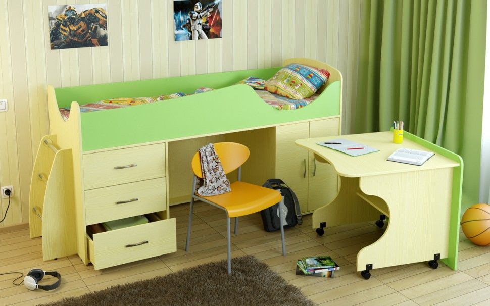 ОписаниеКровать чердак "Карлсон Мини-4". Компактный модуль с шкафом, комодом и столом. Лестница с хромированными ступенями надежно закреплена с фасада. Спуск и подъем по такой лестнице развивает координацию движений ребенка.