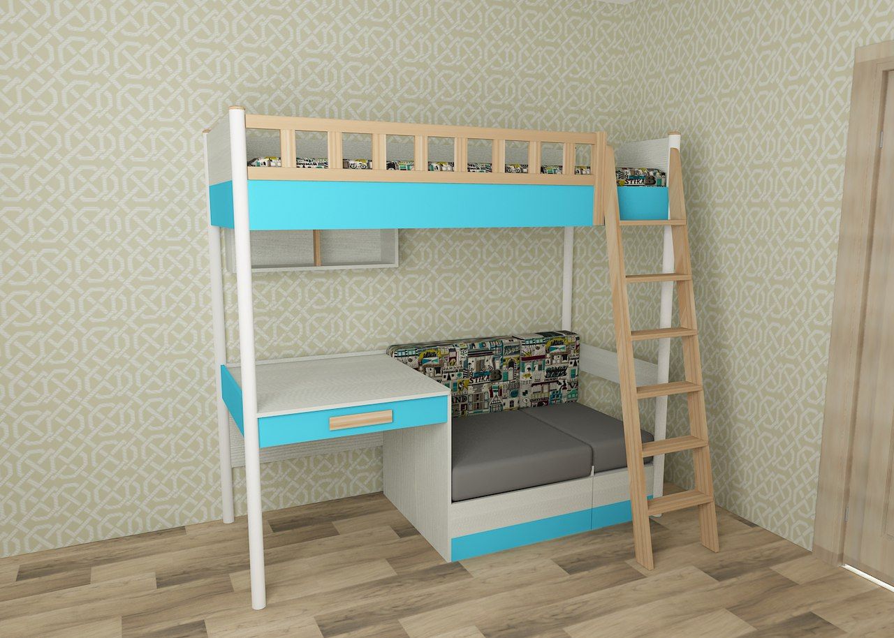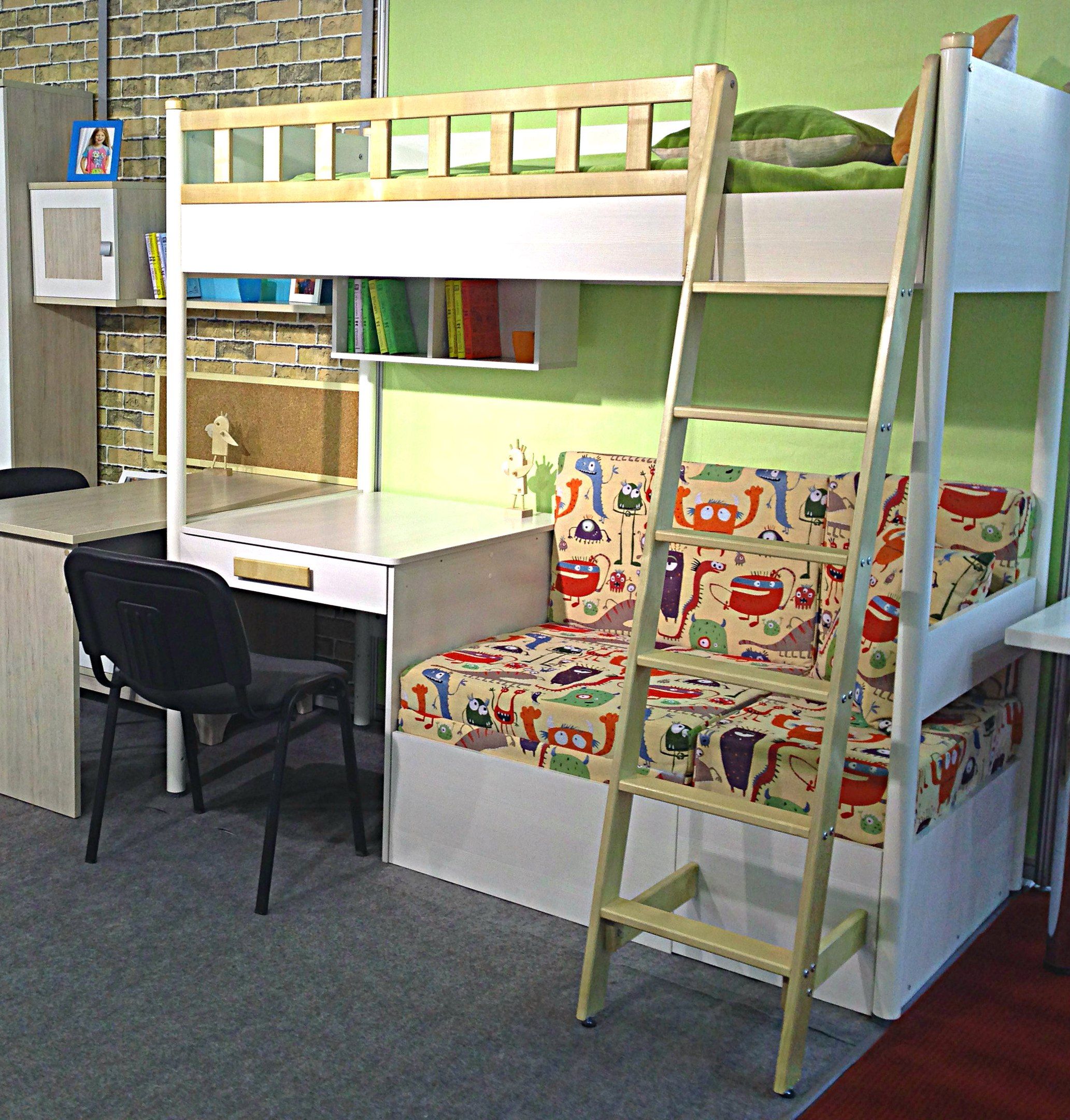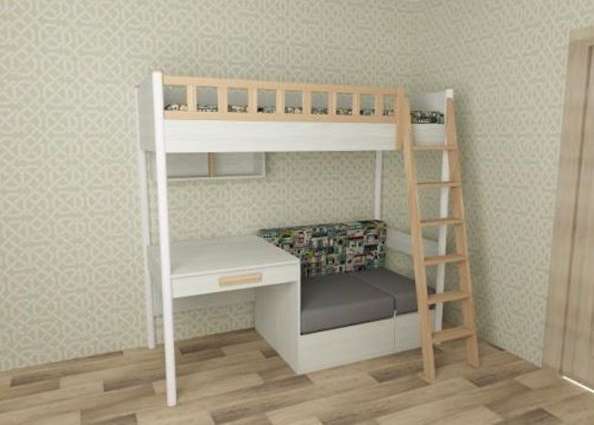 Очень удобный и практичный комплект. Кровать-чердак со столом и встроенным диваном со спальным местом. Занимает минимум места в комнате. Оптимально продумана высота учебного места под кроватью, что позволяет с комфортом пользоваться письменным столом.