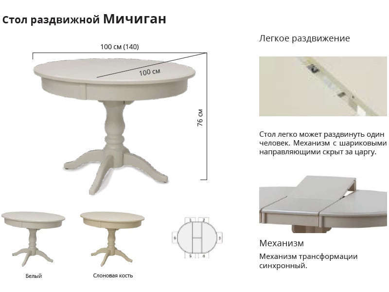 ОписаниеОбеденный стол Leset "Мичиган" представлен в двух цветах: белый и слоновая кость. Ножки сделаны из массива бука, столешница - МДФ, облицованная натуральным шпоном ясеня. Стол раскладывается с помощью механизма "Бабочка". Стол Leset "Мичиган" - отличное соотношение цены и качества.