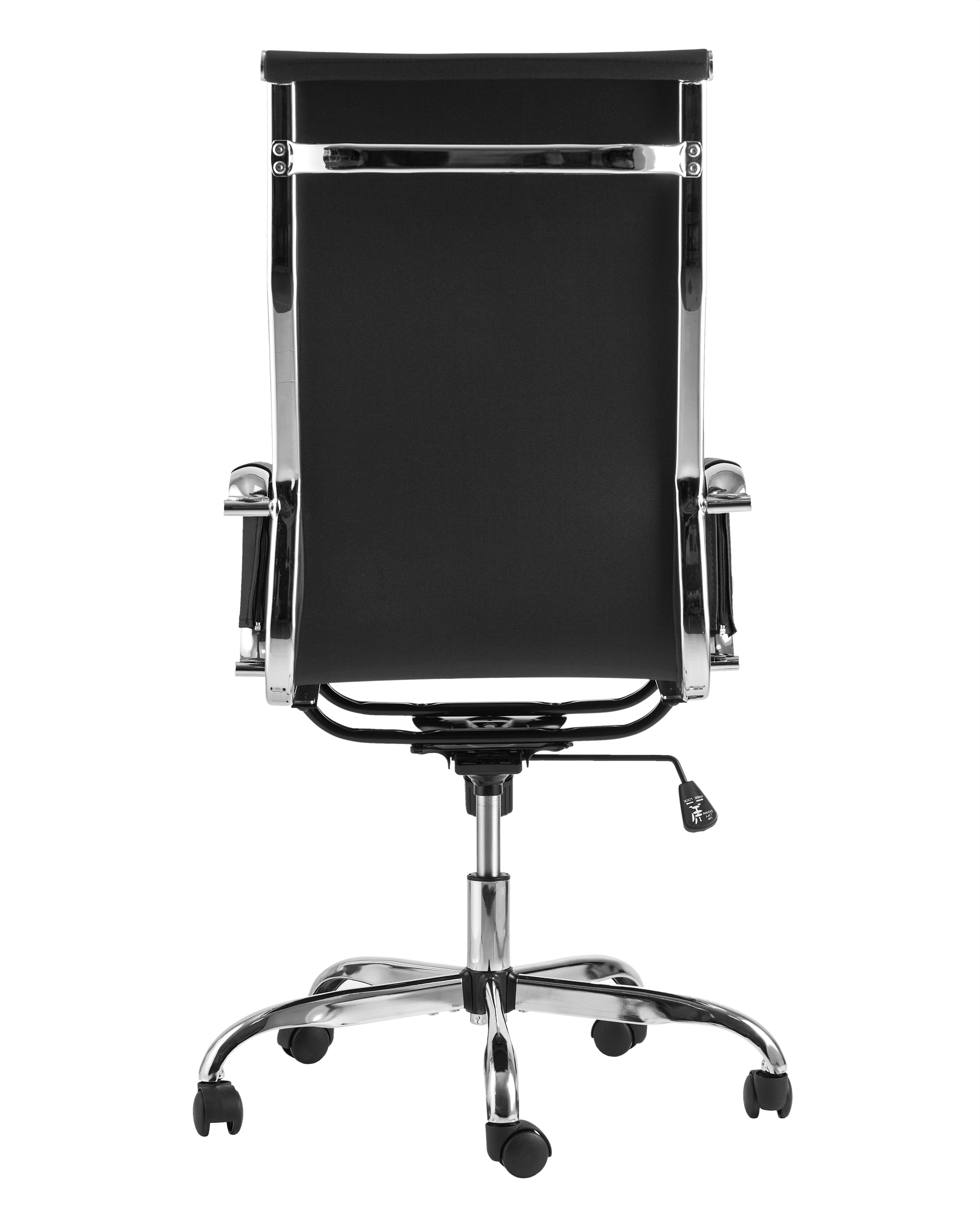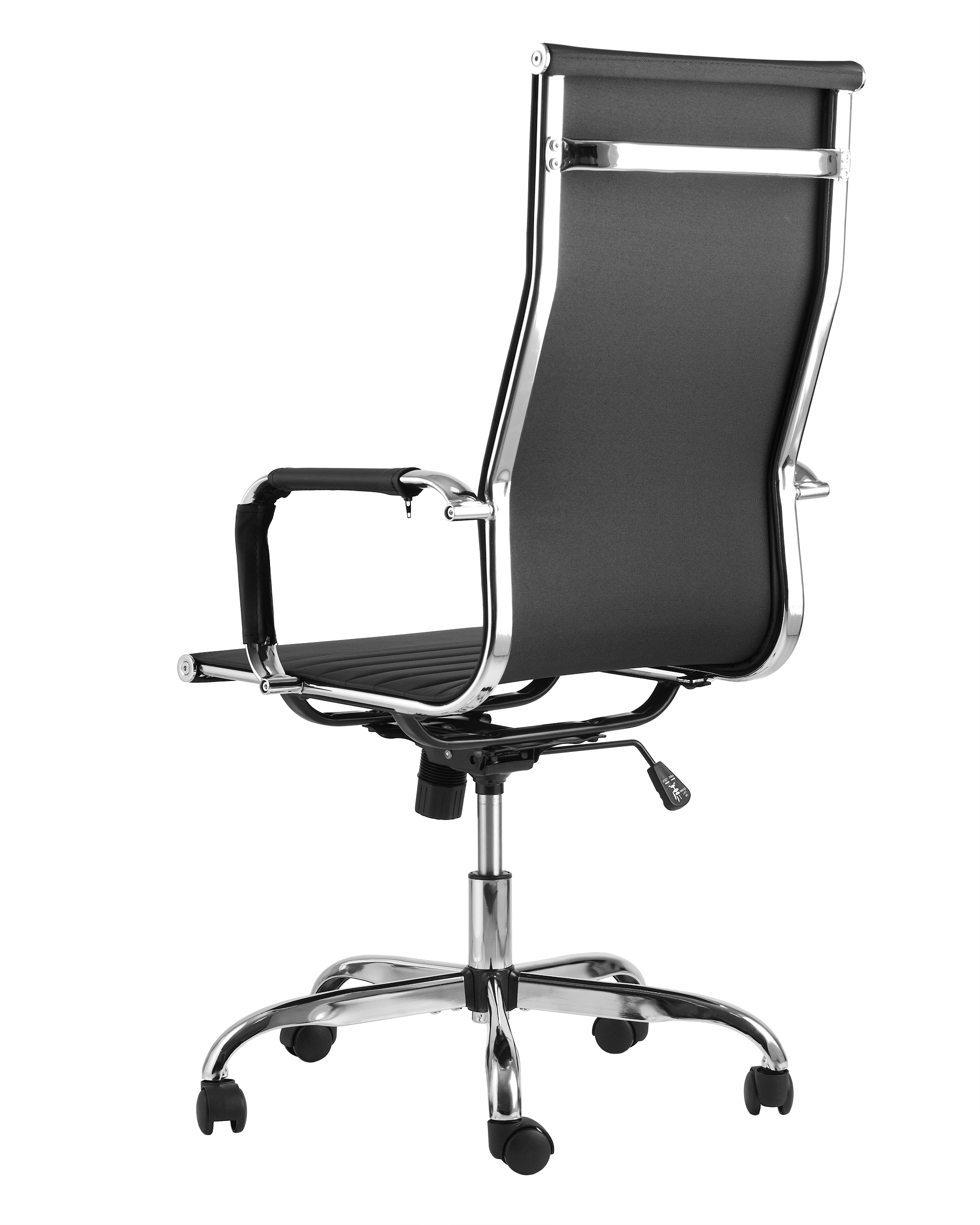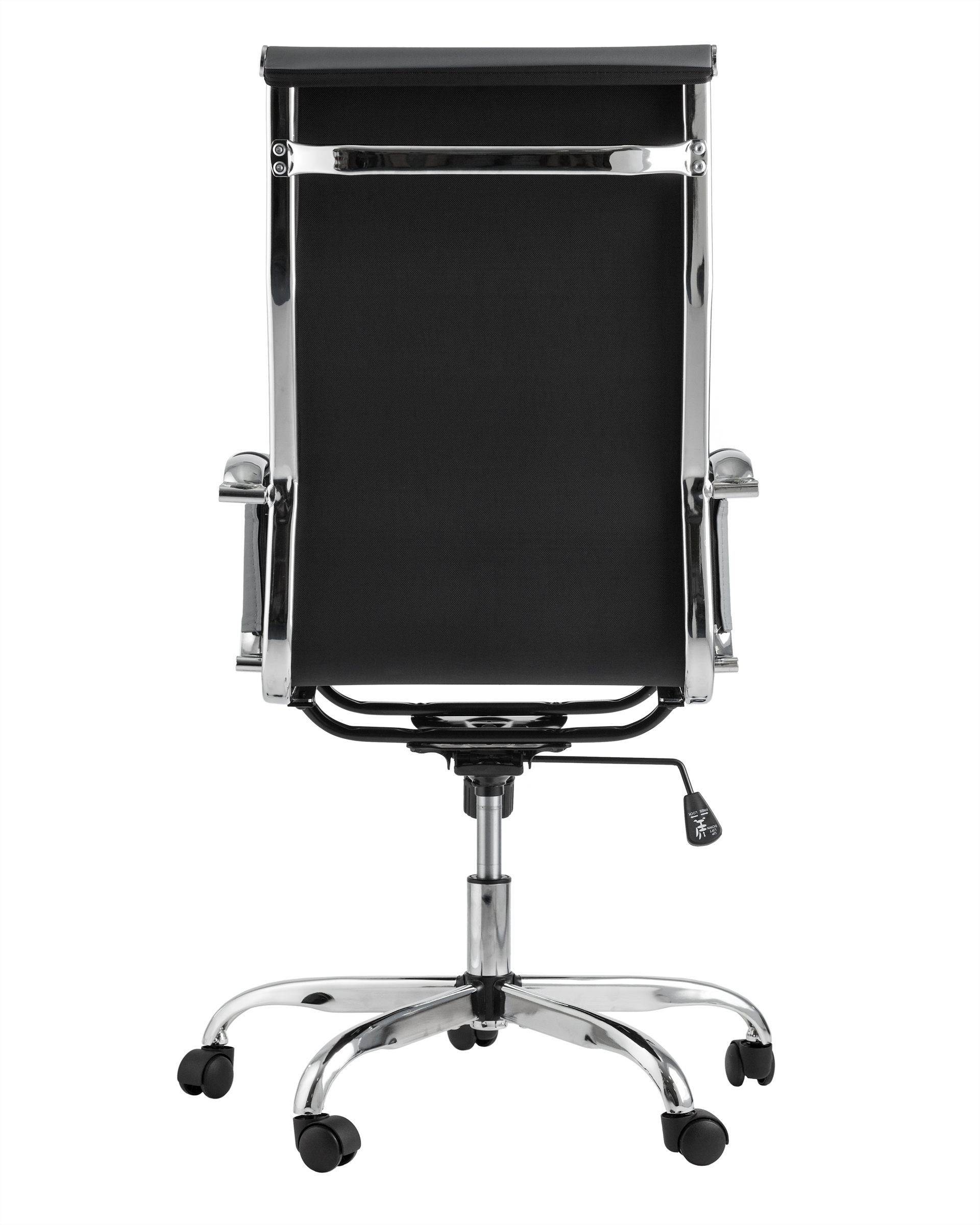 Сиденье и спинка кресла изготовлены из экокожи. Этот же материал используется для чехлов на подлокотниках. Крестовина и подлокотники выполнены из хромированного металла.