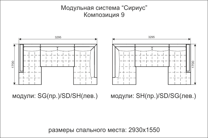 Основой системы является прямой модуль SD, к которому обязательно с обеих сторон пристыковываются оттоманки (SG, SH, ST, SE) и/или подлокотники (SB, SB+). Модуль SD оснащен надежным механизмом трансформации "Дельфин", при раскладывании совместно с оттоманкой образует просторное спальное место. При использовании модуля SD без оттоманки (композиция 13 и 14) формируется нестандартное спальное место 1360 х1550 мм.