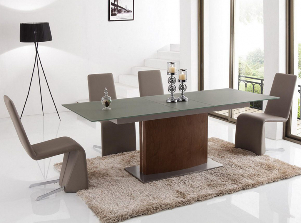 ОписаниеCтол-трансформер HT-2156. На массивной стальной подставке расположилась нога стола, шпонированная под тёмный орех, а на ней, в свою очередь, столешница с листом прочнейшего непрозрачного калёного стекла кремового цвета. Установить центральную секцию, чтобы увеличить площадь стола, не составляет труда, благодаря надёжному механизму.