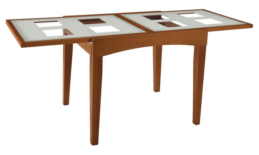 Столешница и вкладыш – рамки из массива бука с закаленным стеклом. Закаленное стекло прочный материал, не имеющий пор, в связи с чем идеально подходит для кухонной мебели, которая должна соответствовать санитарно-гигиеническим нормам.